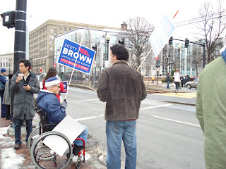 We were at Northeastern University in the hours before Obama's appearance at the Martha Coakley “rally” in Boston today. The people who were lined up waiting to go in appeared comatose as they awaited their messiah. Few Coakley signs were seen, and no enthusiasm was felt. The Brown supporters who turned out, by contrast, were really psyched and fun to talk to. Three cheers for the Northeastern University Republican Club who had an energetic group. We also met lots of people from all over, including a new American citizen from Argentina, and a fellow from Texas who came to help us out!